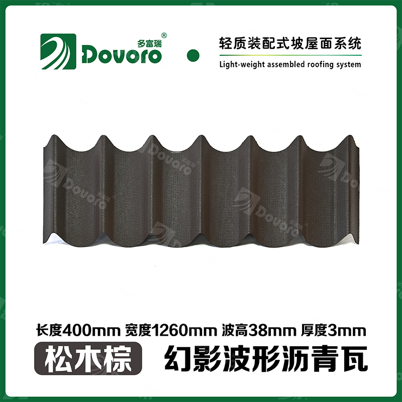 多富瑞幻影波形瀝青瓦是由礦植物纖維板經(jīng)過(guò)整形后浸漬瀝青而成,一次成型的基層板在高溫下浸漬瀝青,使瓦材整體性更加牢固;熱固性樹脂保證了瓦材的強(qiáng)度和剛度;進(jìn)口原料配合先進(jìn)的著色工藝確保顏色持久、混色噴涂工藝使瓦材外觀高雅、色彩美觀、立體質(zhì)感。